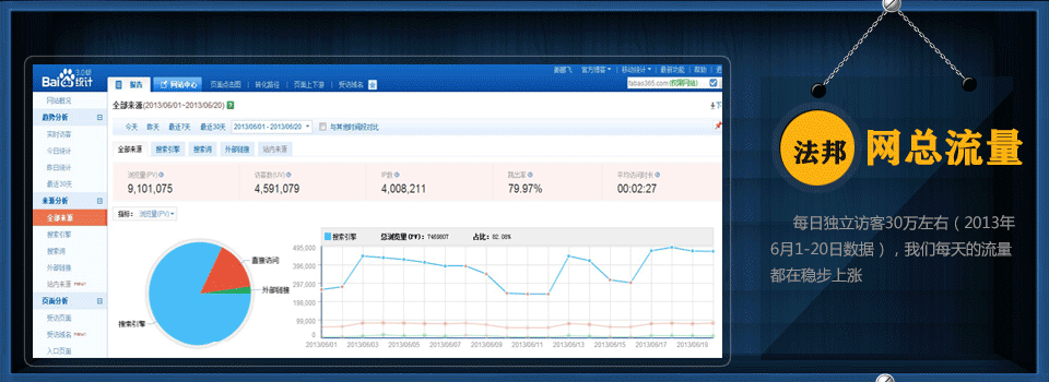 我们给您一个准确的数据吧,法邦网近一周的全球排名是9000多,独立访客数为每天30万左右,我们可以给您提供第三方统计数据(百度统计),您也可以很快捷的通过第三方的工具进行查询(百度搜索一下,网站排名),在里面输入我们的网址就可以看到我们网站的排名和浏览量。这个虽然不准确,但是可以参考。您可以在看一下您认为流量高的网站和我们网站在这个统计工具里面的数据表现,做一个判断。