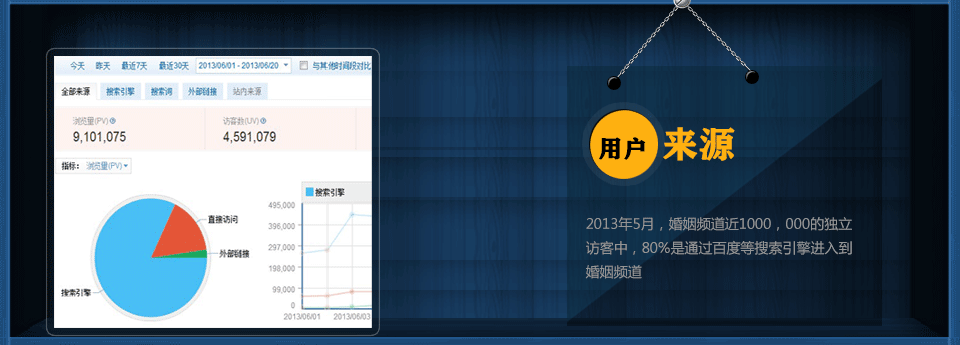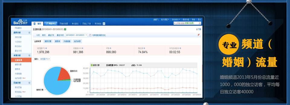截止到2013年5月低,我们在百度有160,000的收录,关键词有120,000。整个5月份,我们的婚姻频道有100多万的访客数(访客数,是指访问的实际人数),其中有90%是通过搜索引擎搜索相关的关键词来的,另外10%是直接访问我们的网站或者在其他相关网站投放的广告产生的,并且我们每月的访客数还在不断的增加。