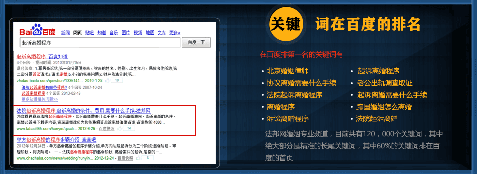 (2)我们的专业频道是根据用户的需求来建立的,专业频道的结构体系、内容体系符合用户、搜索引擎的需要。可以在用户出现婚姻问题时的第一阶段(阅读相关资讯知识)就把用户拦截下来。并且给用户提供能解决问题的内容,从而让用户对我们整个频道、律师产生好感,并咨询、委托律师。