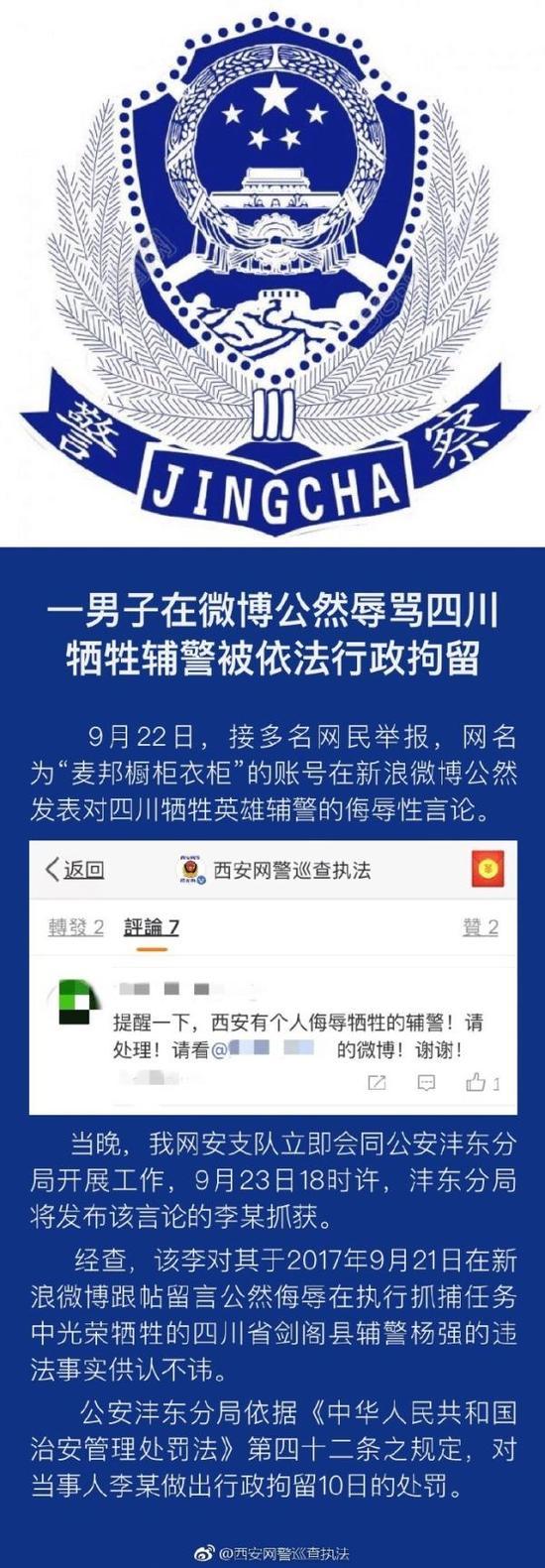 西安市公安局网络安全保卫支队官方微博9月24日消息,9月22日,接多名网友举报,网名为“麦邦橱柜衣柜”的账号在新浪微博公然发表对四川牺牲英雄辅警的侮辱性言论。当晚,我网安支队立即同公安沣东分局将发布该言论的李某抓获。