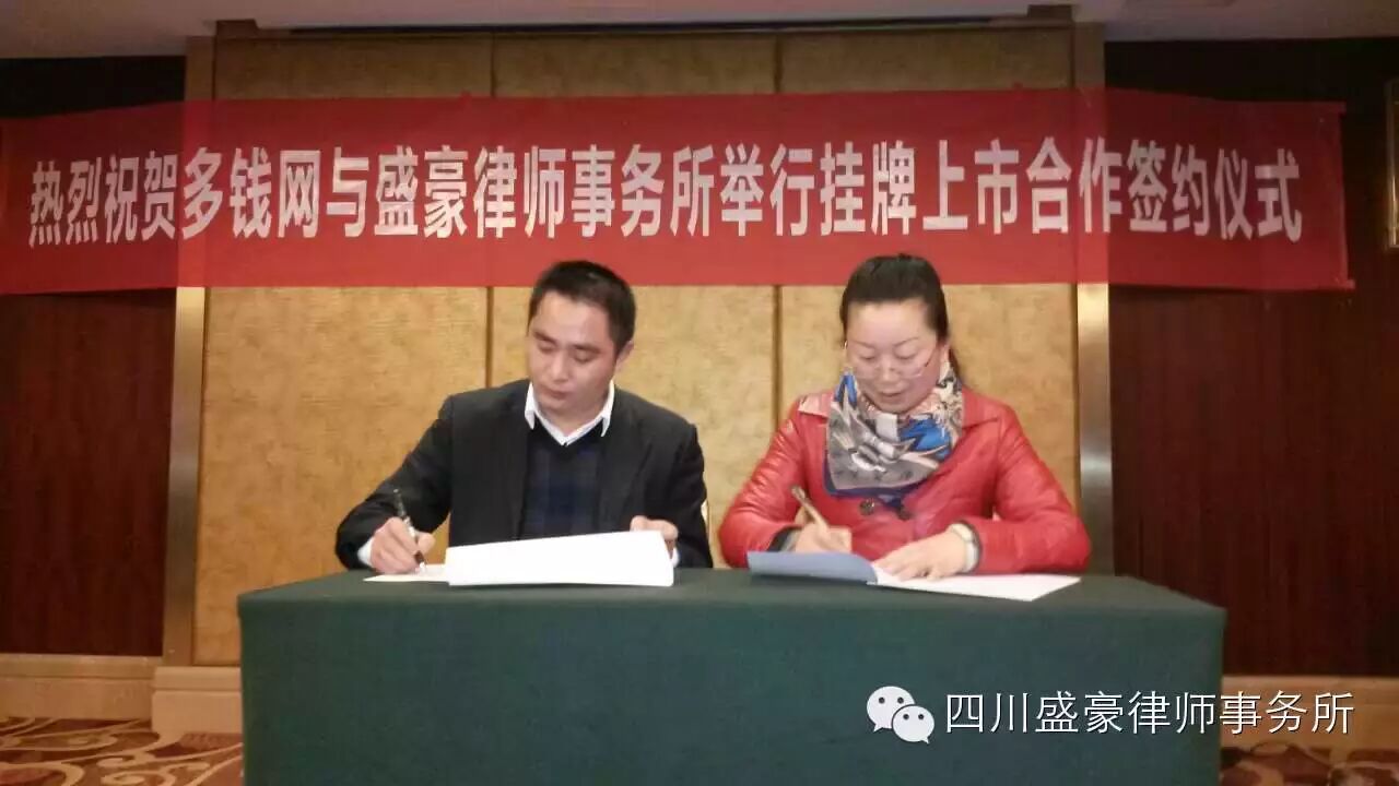 2014年12月18日下午,四川盛豪律师事务所携手多钱网络科技有限公司开展了“中小企业在场外市场的融资之道”培训,并与该公司达成战略合作协议。盛豪律师事务所曾主任与多钱网彭总分别代表双方公司在协议上签字,此协议的签订必将促成双方合作帮助更多中小微企业成功跨入多层次资本市场.