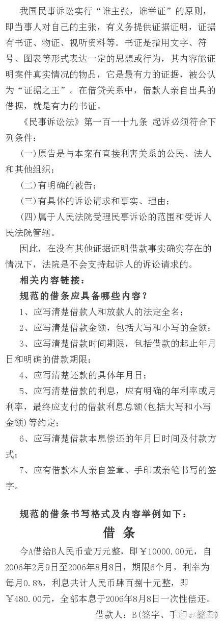 在借贷关系中,借款人亲自出具的借据,就是有力的书证。在没有其他证据证明借款事实确实存在的情况下,法院是不会支持起诉人的诉讼请求的……