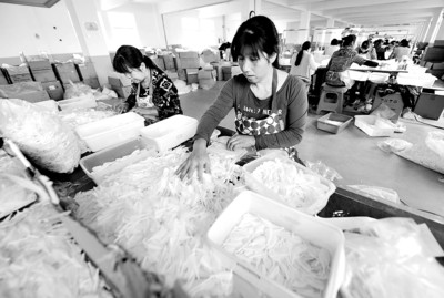 日前,和县三才体育用品公司生产车间,工人在生产三段式羽毛球。该羽毛球获得发明专利,2013年经中国体育总局专家组鉴定,一致认定三段式羽毛球为国际首创。2014年底正式投产,因其耐打性强迅速获得业内认可,为川崎等多家羽毛球公司做代工,远销印尼、孟加拉等南亚国家,月销售100余万只羽毛球。本报记者徐昊本报通讯员常兴胜摄