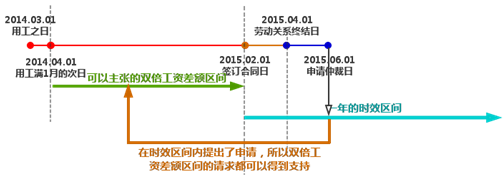 按照第一种观点,本案可以被支持的双倍工资差额为2014年6月1日至2015年1月31日的部分,共计8个月。详见下图: