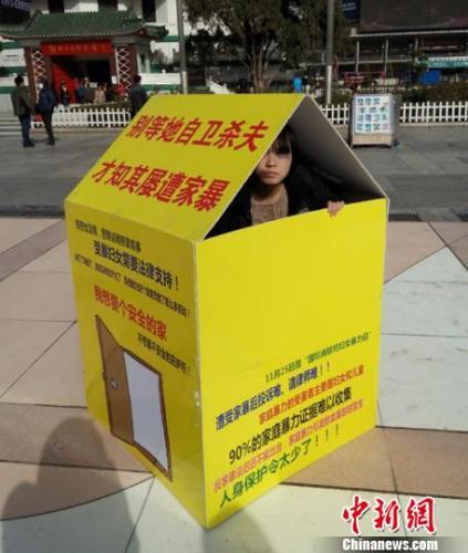 资料图:行为艺术表演:受家暴女性自建“房子”求庇护。郭晶摄