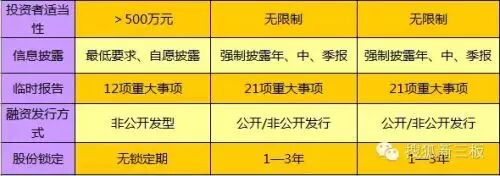 信息披露方面,新三板实行“适度披露”原则。与主板、创业板相比,新三板对强制披露事项、流程进行简化。例如,不要求披露季报,指定网站披露即可。具体制度区别如下图: