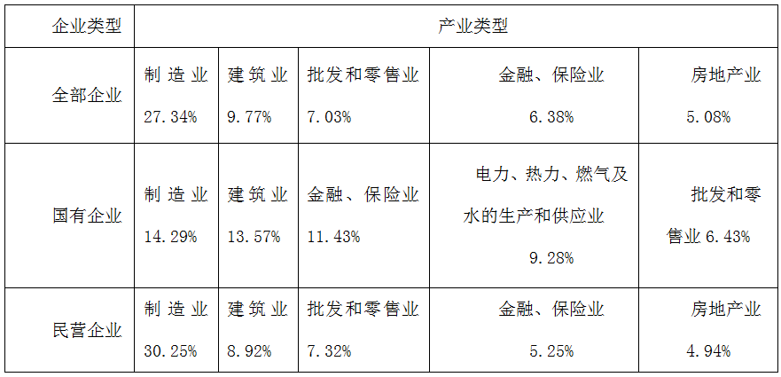 在涉案企业的产业类型方面,制造业、建筑业和金融、保险业是国有企业和民营企业涉案的共同高发产业领域。同时,在电力、热力、燃气及水的生产和供应业中,国有企业涉案较多;而民营企业还较多的集中于批发和零售业、房地产业。与2014年的统计结论不同之处在于房地产业、交通运输仓储业和邮政业、信息传输计算机服务和软件业不再是国有企业的高发产业领域。