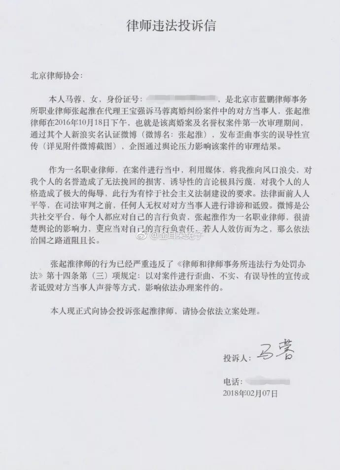 2月7日,马蓉在网上晒出了一张律师违法投诉信,投诉了王宝强的代理律师张起淮。投诉信中称,张起淮在自己和王宝强的离婚案中,多次发布歪曲自己的的误导性宣传,利用媒体将自己推进深渊,对自己人格造成极大侮辱,这不符合社会主义法治建设的要求。她还说:“人要对自己的言行负责,债迟早都要还。谎言不会一直掩盖真相,正如乌云不能永远遮住太阳。希望有关部门公正处理,以正视听!”