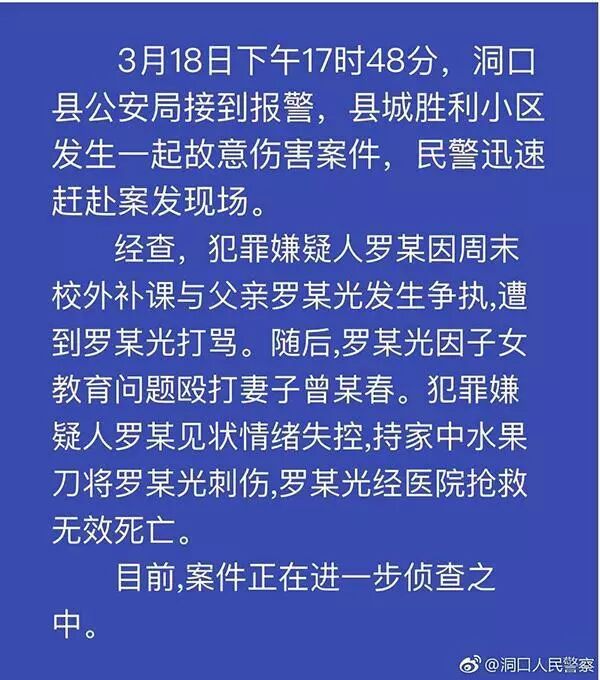 3月18 日下午 ,邵阳洞口县罗某光因家庭矛盾和周末校外补课问题与上高一的女儿罗某(15岁)发生争执。罗某遭到了父亲的打骂,父亲打骂了女儿后,又责怪妻子曾某春对女儿管教不严,两人为此发生口角,继而跑进主卧室扣上门厮打。犯罪嫌疑人罗某见状情绪失控,手持家中水果刀将父亲罗某光刺伤,罗某光经医院抢救无效死亡。