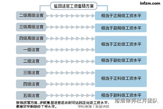 在“盐田版”基础上形成的这一方案,决定对法官实行与法官等级挂钩的薪级工资制度。法官担任领导职务的,工资福利及社会保障也按照法官等级而非行政级别来确定。
