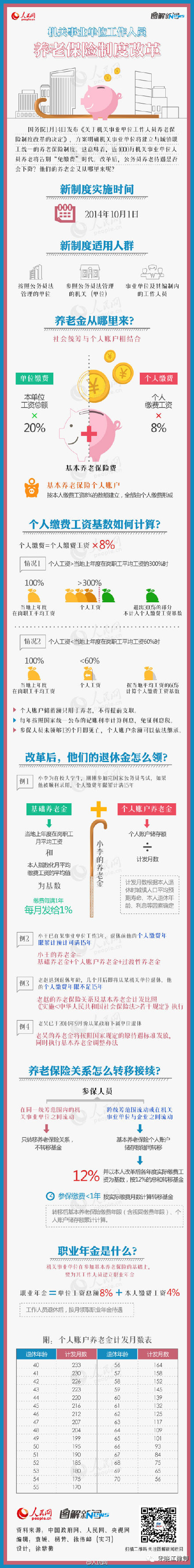 国务院今日发布《关于机关事业单位工作人员养老保险制度改革的决定》,明确机关事业单位将建立与城镇职工统一的养老保险制度。这意味着近4000万机关事业单位人员养老将告别“免缴费”时代。改革后,公务员养老待遇会否下降?他们的养老金又从哪里来?