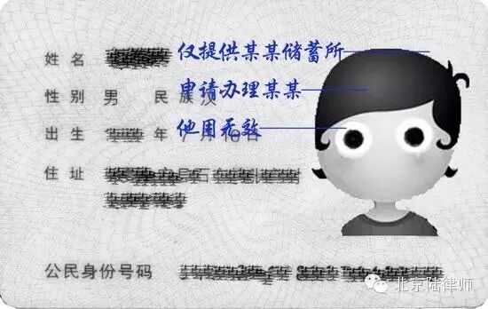 4.上述文字一定要签在身份证的范围内,但不要遮住(身份证上的姓名、文字及号码)。无论是信用卡、基金、手机、申请书,只要须附身份证复印件的,或填写和身份证有类似作用的表格,一律照此办理。另外,对各类申请书内尚未填写的空格,如:附卡申请,加买保险,加买第二支基金,申请手机号等等,这些空格都必须打上,以免被不法业者补填它用。